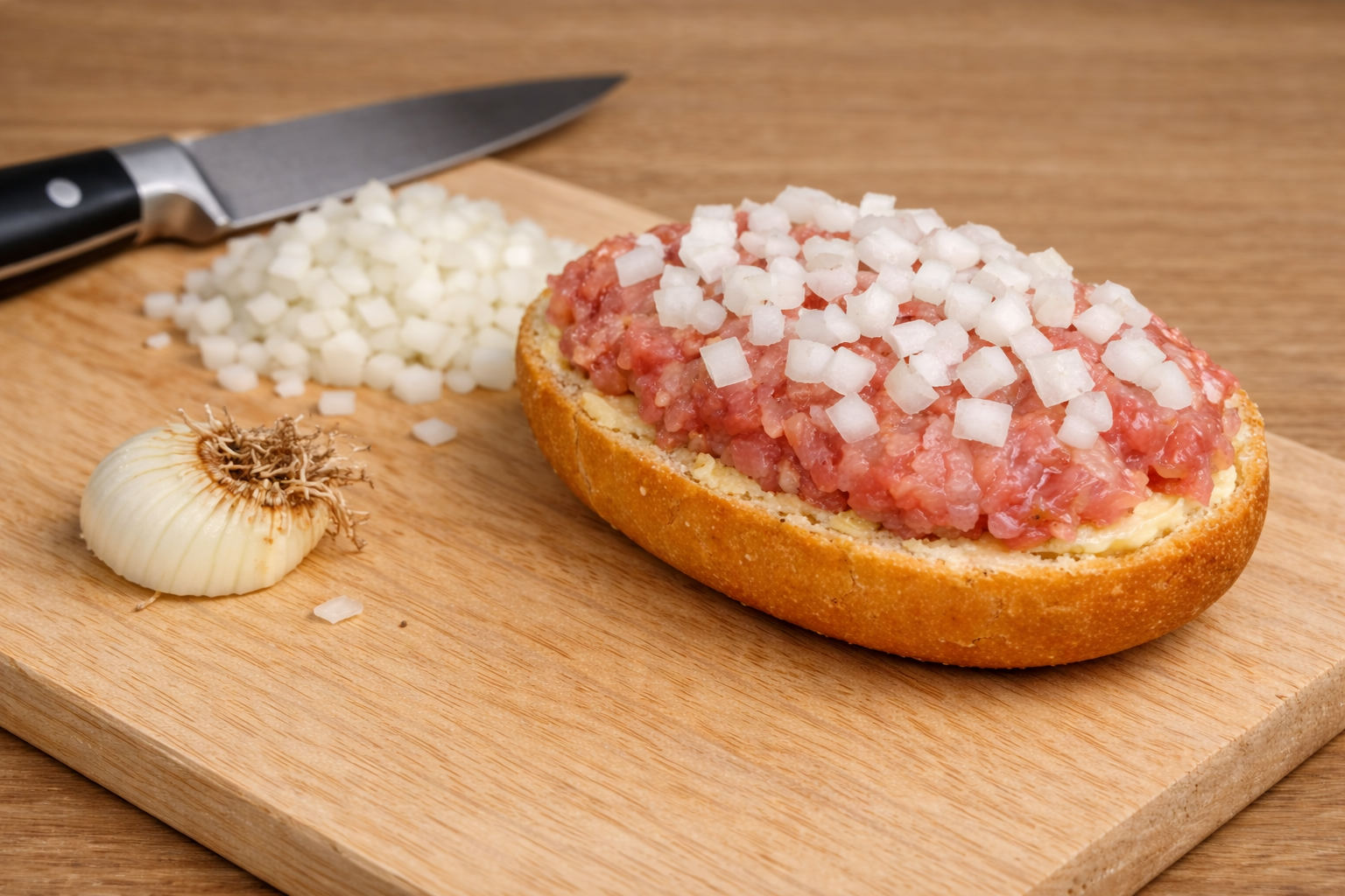Das originale Mettwoch Rezept. Brötchen, frisches Mett, Zwiebeln & Salz & Pfeffer.